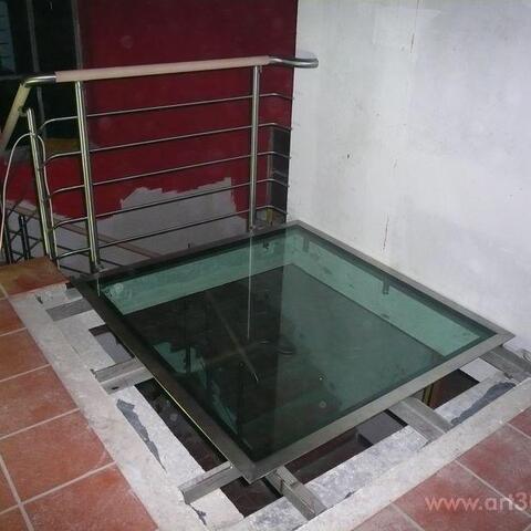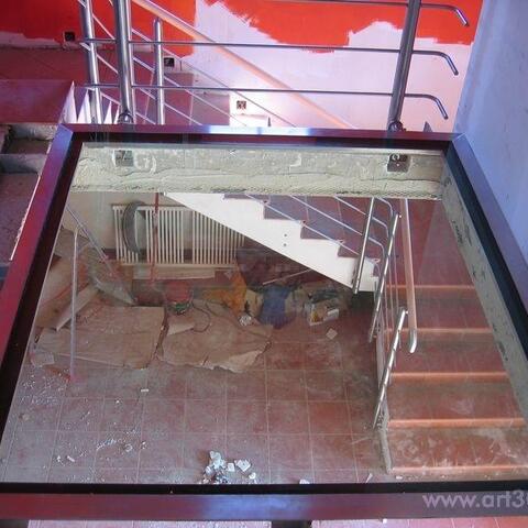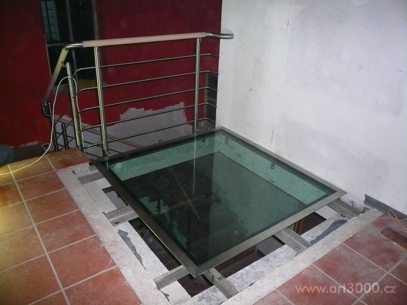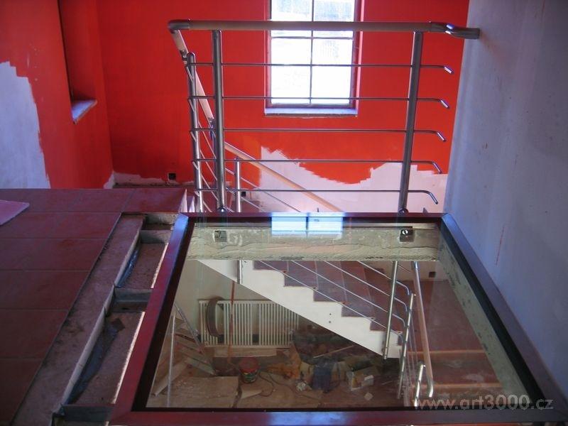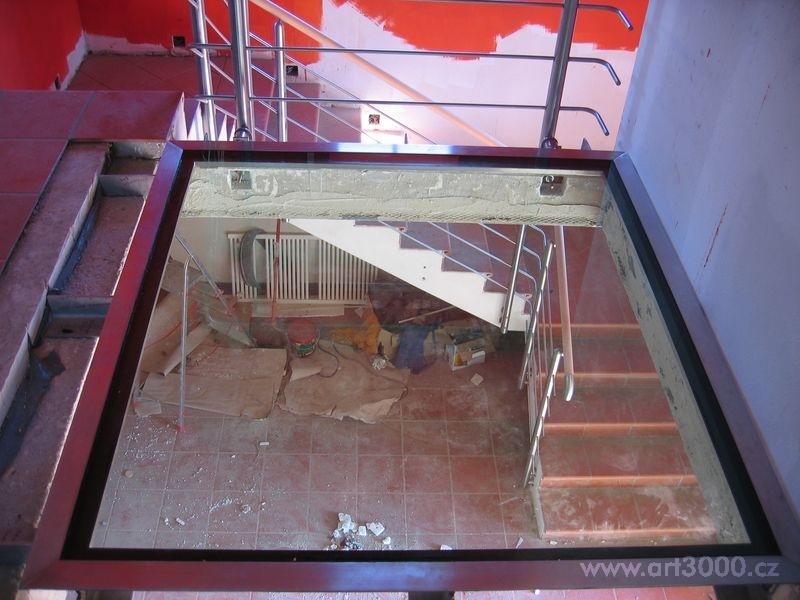 Pochozí sklo lepené 3x12 mm zapuštěné v nerezovém rámu.