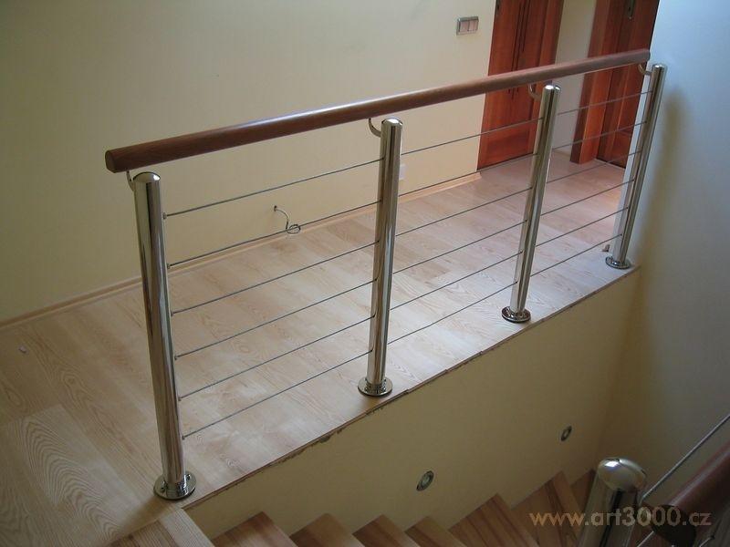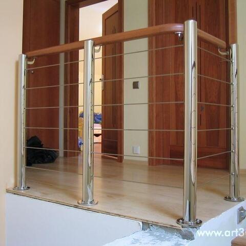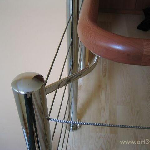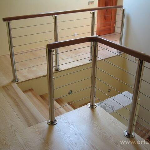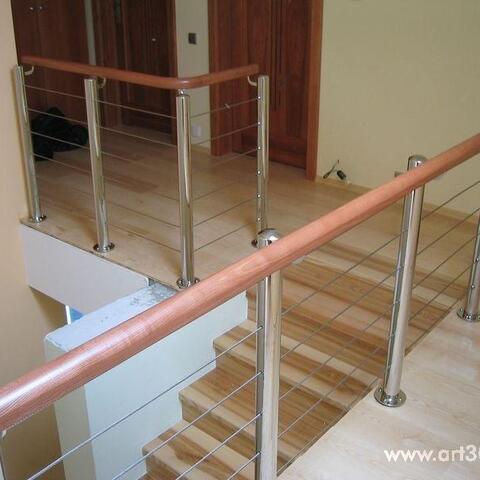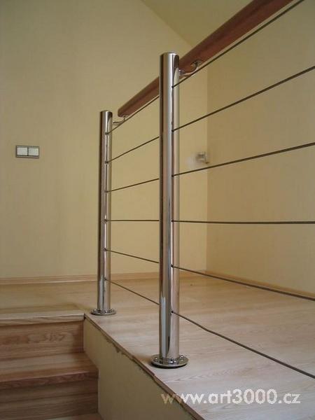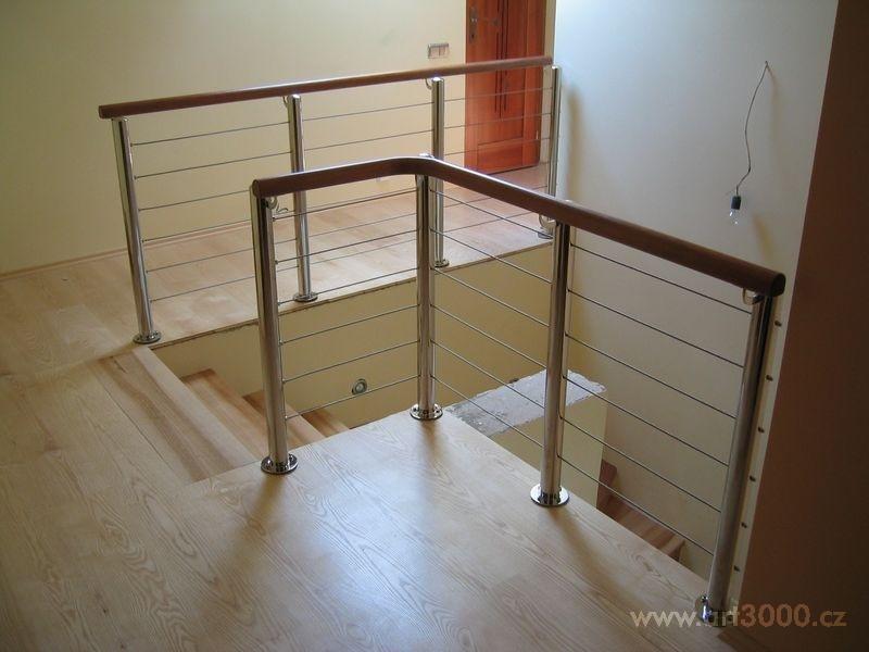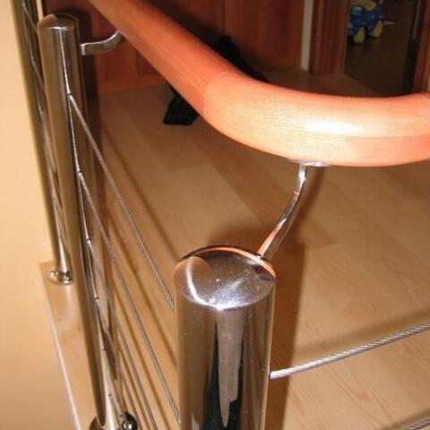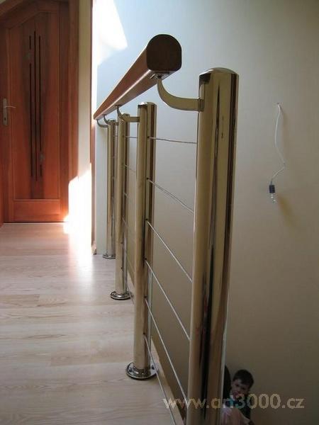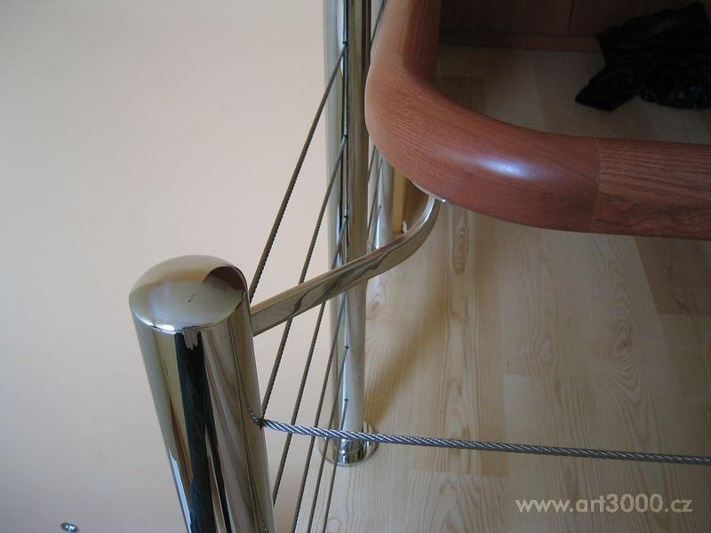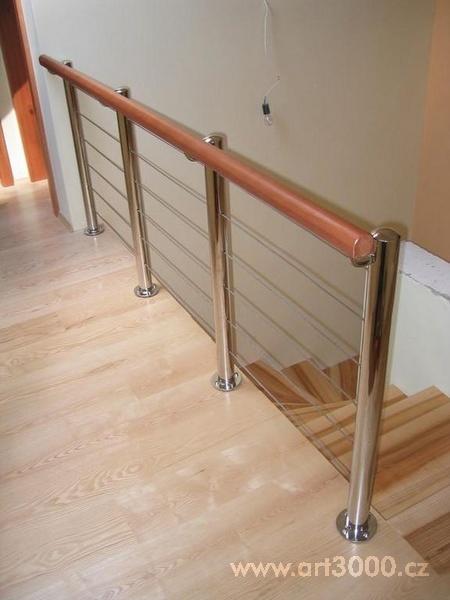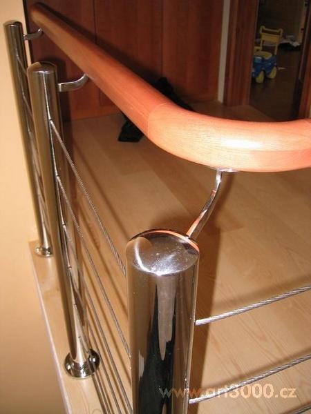 Ukázka nerezového leštěného zábradlí s dřevěným madlem a výplní z nerez lanek.