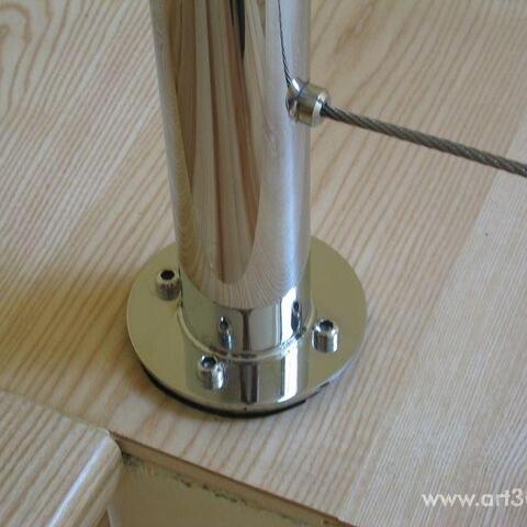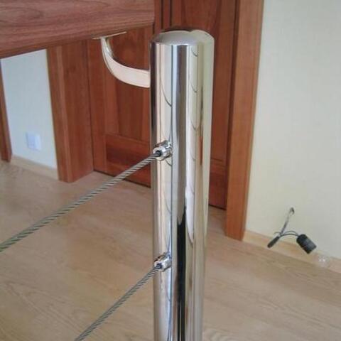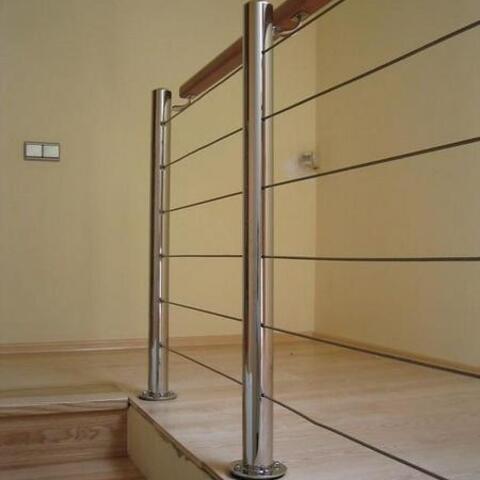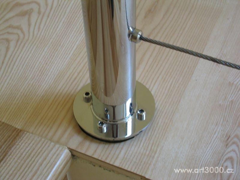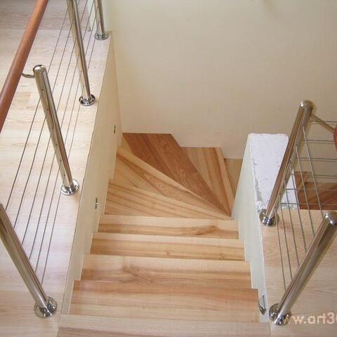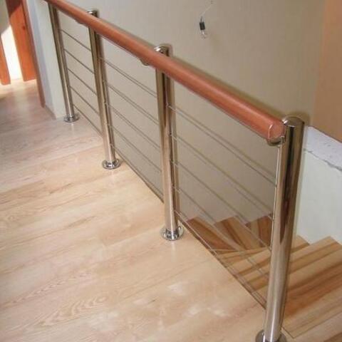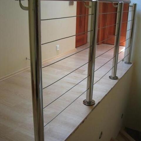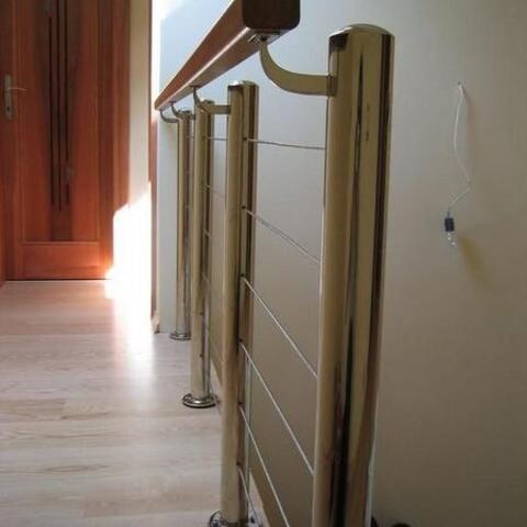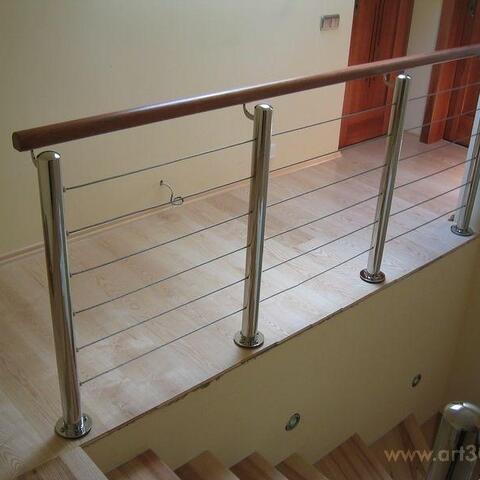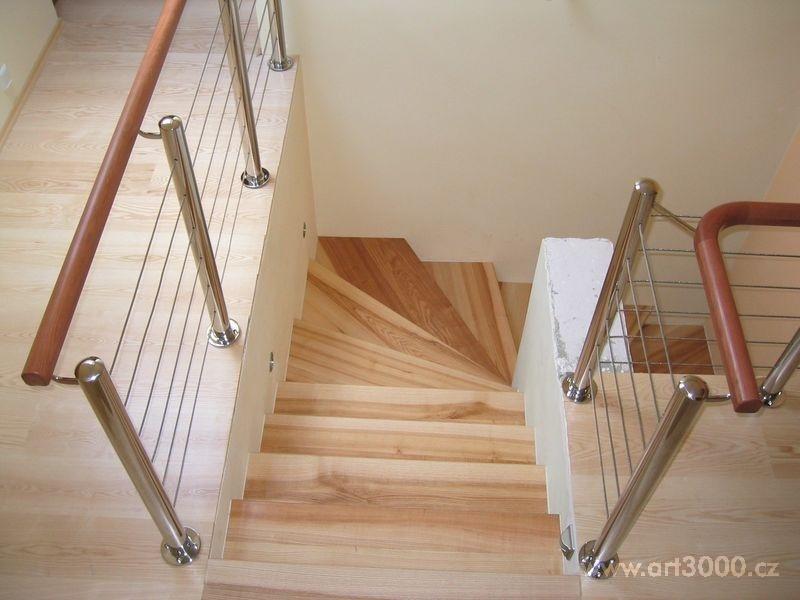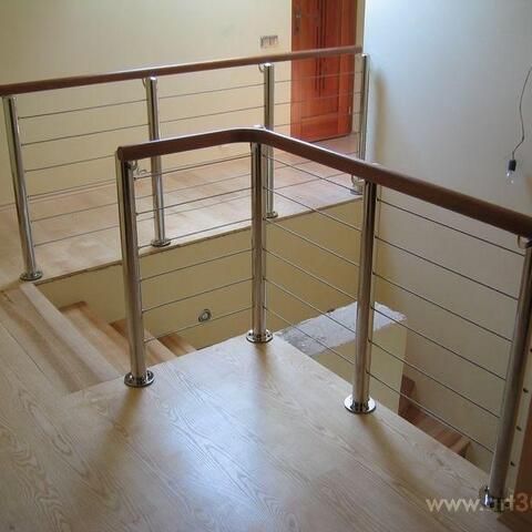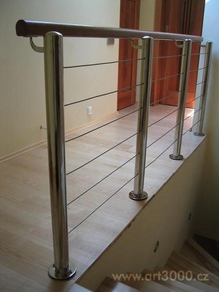 Ukázka nerezového leštěného zábradlí s dřevěným madlem a výplní z nerez lanek.